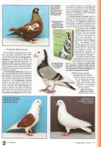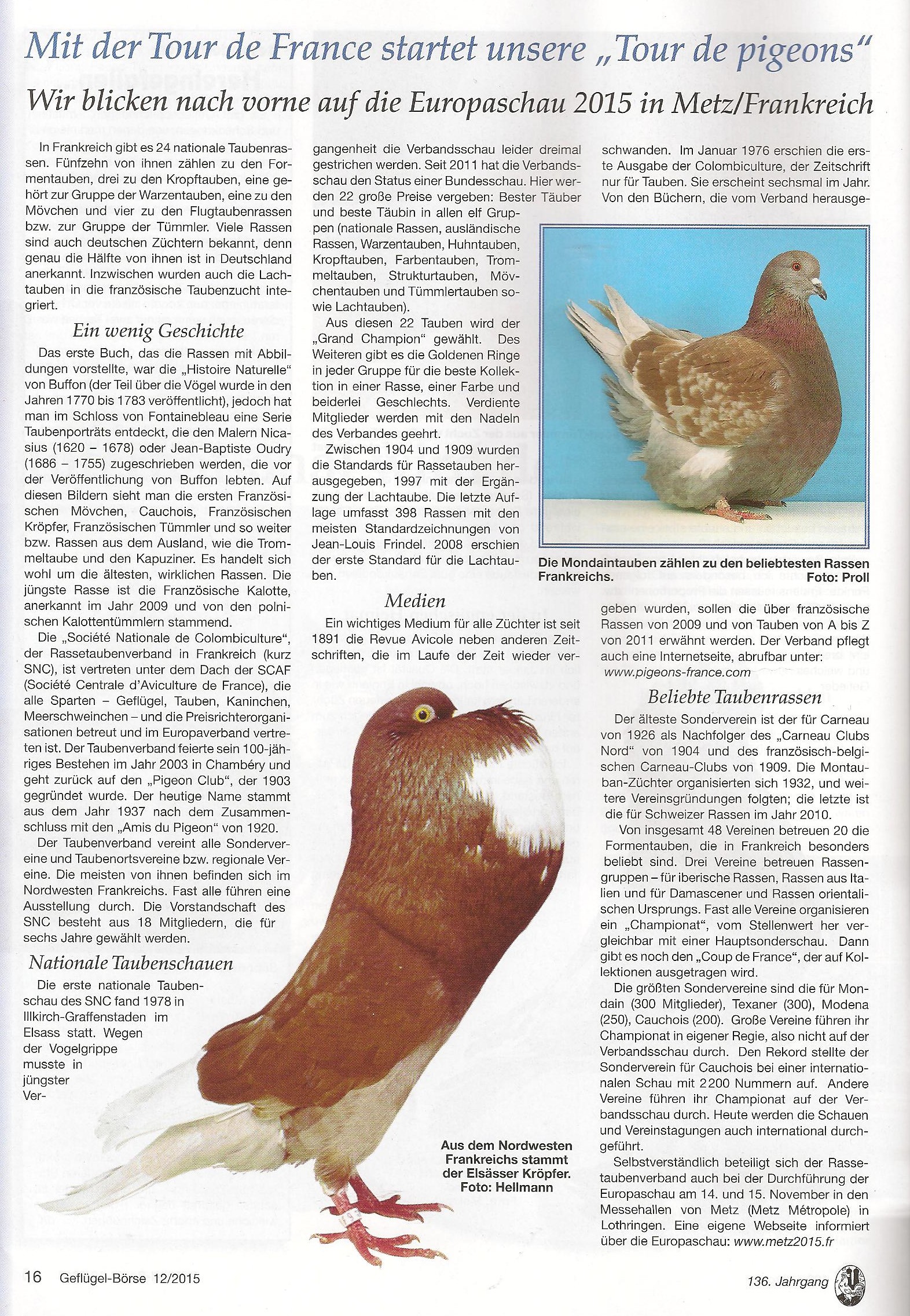Geflügel Börse est un des deux magazines avicoles les plus distribués en Allemagne et chez les lecteurs de langue allemande. Dans le numéro 12 de cette année, un article met en valeur la colombiculture française et la prochaine Exposition européenne de Metz. Le texte transmis par Christian Binois a été adapté et traduit par le rédacteur en chef de la partie « pigeons » de la revue, Remco de Koster.